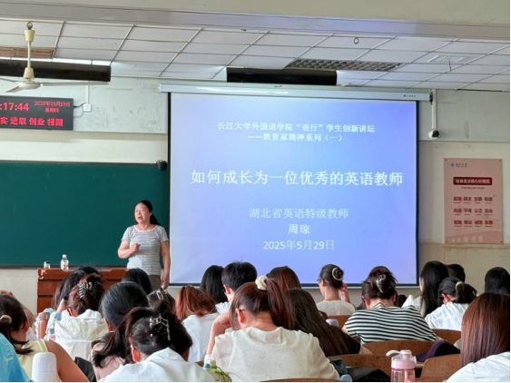 (通讯员 蔡晓宇)为赋能英语师范专业学生,助力其明晰成长路径、培育教育家精神,5月29日,乐鱼平台(中国)“语行”学生创新讲坛——教育家精神系列(一)在12教202教室顺利举行。本次讲座由王娟老师主持,特邀湖北省英语特级教师周琼,以“如何成长为一位优秀的英语教师”为主题展开深度分享,乐鱼平台英语(师范)专业本科生、学科英语硕士生参加。