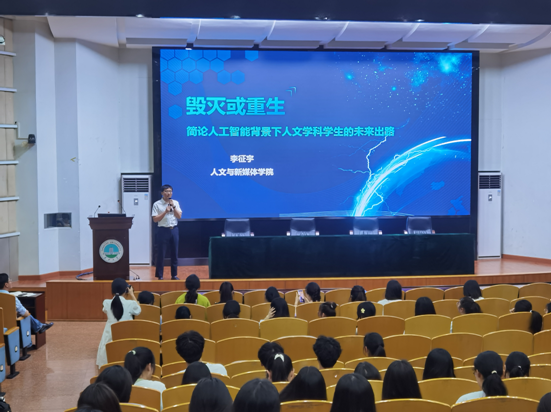 李征宇教授以“毁灭或重生——简论人工智能背景下人文学科学生的未来出路”为主题进行讲述。李征宇教授基于自己的教学经验与目前考研现状为同学们讲述了作为学习人文学科的学生所应具备的精神面貌和学习态度。他强调,应以积极的心态和合理的方法去迎接人工智能所带来的机遇与挑战。