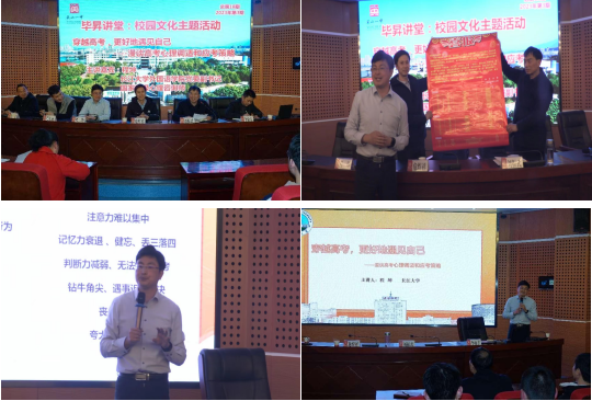 在英山一中,走访组与该校校领导、高三年级主任和部分班主任进行了座谈。程坤以“穿越高考,更好地遇见自己”为主题,在该校“毕昇讲坛”为高三年级部分师生开展了心理健康教育讲座。讲座由英山一中校长刘振武主持。随后,危煜祥在讲座现场为英山一中送上喜报,并向师生介绍英山一中考入我校学生在校发展情况。最后,刘振武校长还以优秀校友身份向同学们推荐了长江大学。整场讲坛座无虚席,气氛热烈,反响良好。