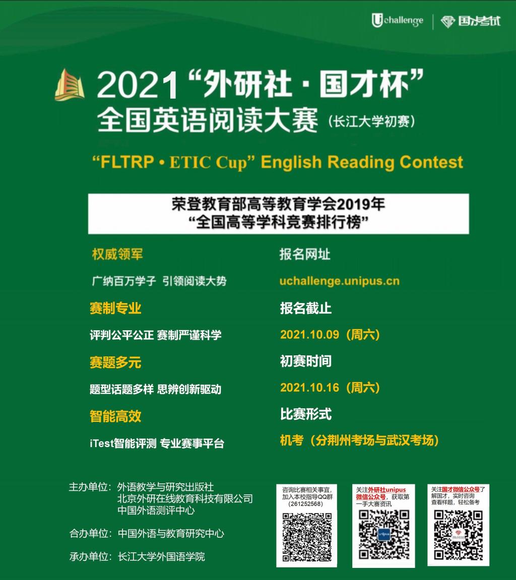 全国英语阅读大赛长江大学初赛时间:2021年10月16日下午。