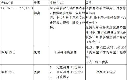 3)报名方式:以学院为单位集中报名。各分团委学生会请于10月8日17:00前择优推荐5名选手,并将报名汇总表以“XX学院—长江大学外研社·国才杯英文演讲比赛”命名后发送至邮箱3027311928@qq.com;并提醒选手上传视频到邮箱3027311928@qq.com并通知选手加入2022长江大学英语演讲比赛群,获取更多信息和比赛指导。