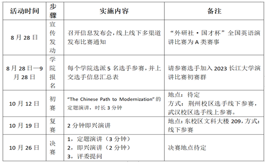 1.报名方式:报名选手加入2023长江大学英语演讲比赛群,获取更多后续信息和比赛指导。(群号:865694849)