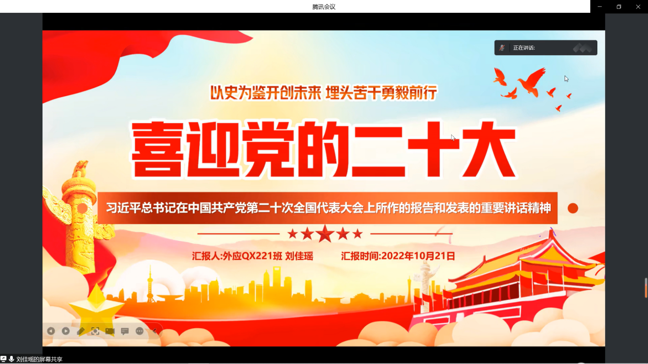 会议伊始,22级外应刘佳瑶同学介绍了习近平总书记在中国共产党第二十次全国代表大会上所作的报告和发表的重要讲话精神,激励大家为建设社会主义现代化国家,全面推进中华民族伟大复兴而奋斗。随后,21级英语笔译周明静同学带领大家学习了马克思主义中国化时代化的最新篇章--《习近平谈治国理政》第四卷的内容,号召同学们认真研读,用其中的思想武装头脑、指导实践。接着22级学科英语李淑婷同学带领大家学习了“深入学习贯彻习近平总书记考察湖北重要讲话精神,呼吁广大青年以赤诚之心投身于社会主义国家和社会事业的建设之中去。之后21级外应沈燕婷同学带领大家学习了中国共产党第十九届中央委员会第七次全体会议及中国共产党第十九届中央纪律检查委员会第七次全体会议精神,深化了大家对党的精神的学习以及坚定地为祖国贡献力量的决心。21级学科英语黄于倩同学带领大家学习了湖北省委书记王蒙徽在省委常委会(扩大)会议上强调的内容:高效统筹疫情防控和经济社会发展,统筹发展和安全,以实际行动迎接党的二十大胜利召开。号召大家积极配合疫情防控工作,维护社会大局稳定。最后,22级英语笔译付李焱同学带领大家学习习近平总书记“7·26”讲话精神,激励大家坚定发展信心,勇担历史责任,勇于开创未来。