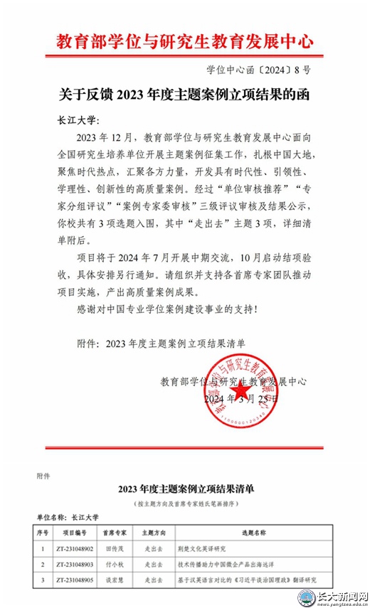 本次获批的3项主题案例分别是谈宏慧教授担任首席专家的《基于汉英语言对比的〈习近平谈治国理政〉翻译研究》、田传茂教授担任首席专家的《荆楚文化英译研究》、付小秋博士担任首席专家的《技术传播助力中国微企产品出海远洋》。三位老师积极响应教育部学位与研究生教育发展中心征集主题案例的核心目标,结合乐鱼平台翻译硕士人才培养的实际需求和教学经验,围绕“走出去”主题,聚焦中国“产品走出去”“教育走出去”“文化走出去”的问题,总结中国经验、讲好中国故事,为建构中国自主知识体系提供案例视角,获得了教育部专家评委的一致认可。