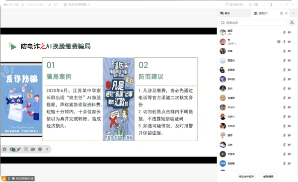 安全教育环节,各班结合具体案例讲解防电诈、防溺水、交通安全及网络安全知识,警示学生警惕AI换脸缴费骗局,提醒学生远离“离岸流夺命野湖”等危险水域,同时,以“电动车闯红灯惨剧”为戒,强调遵守交通规则的重要性,全方位筑牢学生安全防线。