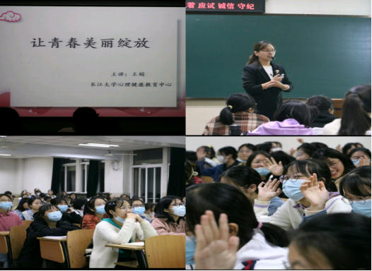 王老师以一组长江大学女生大一军训期间的照片和毕业时的照片对比图为引子,揭示了大学就是一座最高级的美容院——“一个个的懵懂青涩的女孩子通过大学四年的成长纷纷蜕变成自信、优雅的女神”,迅速吸引了同学们的目光。讲座中,王老师主要围绕宿舍关系、两性关系以及人身安全等三个方面,以大量案例和心理学理论为支撑,通过新闻图片、科普视频以及问答互动等方式,进行了生动有趣的讲解。