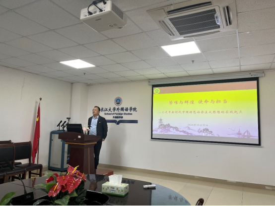 学院党委书记周杰为日语和行政教师党支部党员讲授了一场题为“苦难与辉煌 使命与担当——习近平新时代中国特色社会主义思想的实践起点”的专题党课。党课伊始,周杰深入阐述了习近平新时代中国特色社会主义思想的内容。随后,他通过《习近平的七年知青岁月》,深情回顾了中国共产党的苦难历程与辉煌成就。他希望党员教师要以此次党课为契机,进一步加强学习、提高认识、明确方向、扎实工作,为推动学院各项事业高质量发展贡献自己的力量。