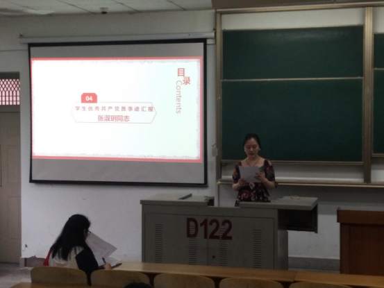 理论学习结束后,张淑玥同志作为年度优秀学生党员向全体学生党员做了事迹汇报。她来自于研究生党支部QX171班,现任乐鱼平台研究生党支部宣传委员、乐鱼平台兼职辅导员、乐鱼平台研究生学生会主席。张淑玥同志勤勉学习开拓进取、刻苦钻研,在工作中甘于奉献,受到老师和同学的一致好评。全体学生党员们听了她的事迹汇报,受到了鼓舞,表示要对标学习,将自己的学习和工作更上一个台阶,为班级学院学校和社会多做贡献,奉献青春。