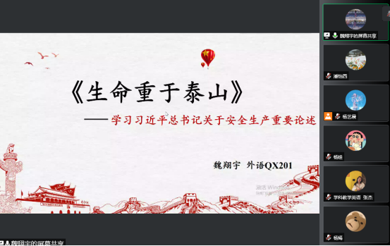 大会伊始,首先由21级外应陈舒同学介绍了“习近平:在庆祝中国共产主义青年团成立100周年大会上的讲话”,强调青春孕育无限希望,青年创造美好明天;21级英语笔译杨娃同学介绍了“习近平给南京大学留学归国青年学者的回信”,青年学者在信中表示,生逢伟大时代是人生之幸,留学归国青年要心系“国家事”、肩扛“国家责”;21级学科英语吴杰同学带领大家学习了“习近平在中共中央政治局第三十九次集体学习”,强调把中国文明历史研究引向深入,推动增强历史自觉坚定文化自信;20级外应魏翔宇同学讲解了“《生命重于泰山——学习习近平总书记关于安全生产重要论述》专题片及解说词全文发布”,指出生命重于泰山,各级党委和政府务必把安全生产摆到重要位置,树牢安全发展理念;20级学科英语王荣同学带领大家学习了《湖北省学校安全条例》,其目的是为了加强学校安全管理,保障学生和教职工的合法权益;20级英语笔译白雪同学讲解了“湖北省安全生产委员会关于贯彻落实国务院安全生产委员会《关于进一步强化安全生产责任落实 坚决防范遏制重特大事故的若干措施》的实施意见”这一专题,指出要深入学习贯彻习近平总书记关于安全生产重要论述和指示批示精神,确保学深悟透、落地见效。