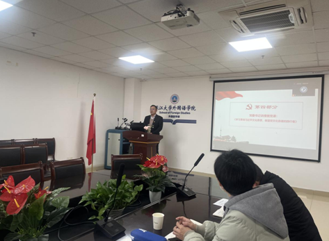 最后,周杰以“学习贯彻习近平文化思想做坚定文化自信的践行者”为题,给党员教师讲了专题党课。他在党课中指出,希望外语教师牢记“为党育人、为国育才”使命,要做坚定文化自信的践行者,做学生为学、为事、为人的示范,促进学生成长为全面发展的人。