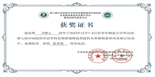 (通讯员 张斯雨)为全面提升师范类院校学生英语教学技能和教学水平,推动未来卓越英语教师综合素养的培养,发挥职前教师教育的引领示范作用,由中国高校外语学科发展联盟主办,华中师范大学承办的“第七届中国高校外语学科发展联盟师范类院校未来教师素质风采展示活动”,于12月8日成功落下帷幕。在此次盛会中,乐鱼平台鲁志荣老师悉心指导的22级学生张斯雨同学荣获二等奖、肖贻之同学荣获优秀奖,展现了我院学子的卓越风采。