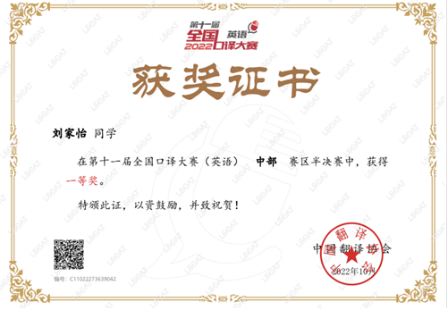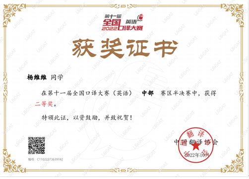 (通讯员 赵宇杰)日前,由中国外文局指导、中国翻译协会主办的第十一届全国口译大赛(英语)交传半决赛落下帷幕。乐鱼平台英语笔译QZ211班研究生刘家怡、杨维维2名同学分别获得中部赛区一等奖和二等奖。其中,刘家怡获晋级全国总决赛交传赛资格。