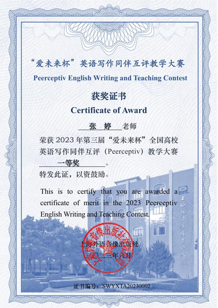 我院张婷老师获得第三届“爱未来杯”全国高校英语写作同伴互评(Peerceptiv)教学大赛一等奖