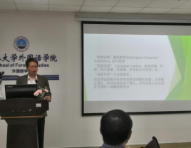 此次讲座的主要内容是:介绍“症候诊断”翻译教学法的内涵,步骤,原则和MTI 专业建设的特色。刘教授首先向大家解释了“症候诊断”翻译教学法的来源和含义。接着,教授引用新疆棉的例子,概括新闻翻译的特征,提出了“德信达”的翻译原则。随后,刘教授详细介绍了“闻问望切”翻译步骤,即从听学生读译文开始,到师生和生生沟通,然后反观原文和译文,最后确定问题所在,提出建议的过程。在讲座中,刘教授提出了MTI专业学生的翻译报告要“突出问题意识,突出观点性,突出主题”的观点,为我们的MTI专业发展带来了启发。同时,刘教授还展示了很多“世界知识”的实例,引发大家对于翻译过程的思考,如“蜜瓜色”,“花见”等特殊词汇应当如何翻译。最后,刘教授还简要介绍了哈尔滨工业大学MTI专业的发展特色。