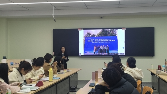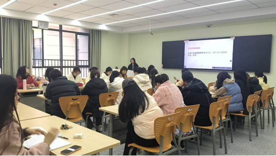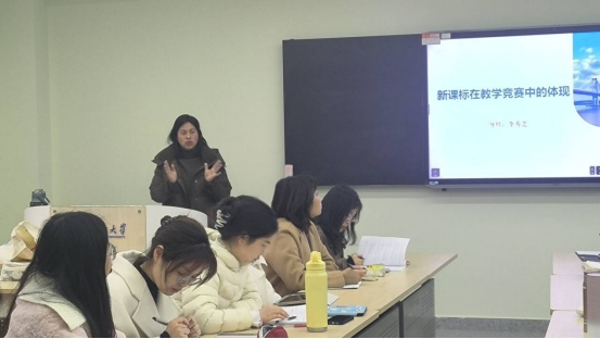 李秀芝副教授以“新课标在教学竞赛中的体现”为题展开论述。基于比赛模拟课堂的特点,李老师强调单元整体解读在英语教学设计中的重要性,引导同学们关注《高中英语新课标》中重要理念的理解与落实,重视学情分析、单元作业设计等方面。