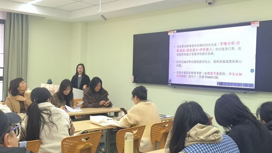 樊辉副教授以语法课为切入点,从创新导入、情景化教学、深度拓展价值观引导等多个方面讲解了教学设计的思路。她鼓励同学们从不同角度分析文本,创造性地结合教学内容,再进一步考虑作者的写作意图,多样化教学活动。