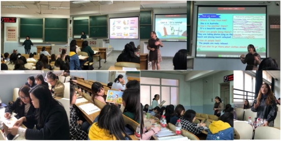 接下来,曹忠慧老师的读写课则让听课的老师们忙碌个不停,一边认真倾听,一边及时做笔记,还时不时拿起手机拍下我们想借鉴的PPT图片,生怕错过了任何一个画面。她的口语如此地流利顺畅,她脸上的笑容如此地甜美可爱,犹如一位邻家小姐姐,当“学生”有不解时,她能机智地用不同的表达来解释,直到“学生”听懂,当学生有不同意见时,她能适时点拨和引导他们的再思考,直到会意地点点头,然后曹老师总是用不一样的语句来鼓励或赞赏她的“学生们”,她的课堂,是能让学生们享受到学习的快乐的课堂!