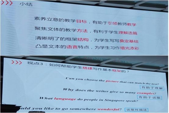 冯老师从六要素整合的英语学习活动观、主题语境、主题和主题意义探究、聚焦主题意义探究的文本解读和聚焦主题意义探究的语篇挖掘五个方面,从理论到案例,深入浅出地进行讲解,重点在文本解读与创意设计。下午,为了加强各位学员对于理论的理解和内化,冯老师以一节读写课为案例,以观课后评课的形式,引导学员们深入理解六要素整合的英语学习活动观和主题引领下的语境分析、意义探究、文本解读和语篇挖掘在读写课中的具体运用。学员们与老师互动热烈,纷纷提出了自己的想法,表达了自己对案例的理解和分析。