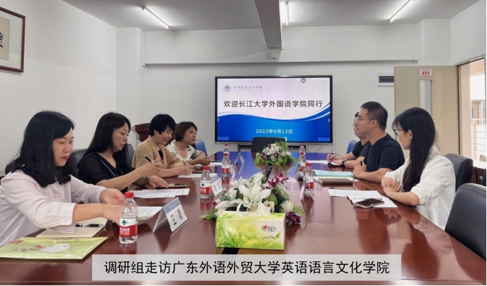 6月12日上午,调研组继续走访广东外语外贸大学英语语言文化学院和国际商务英语学院。英语语言文化学院副院长吴庄教授、语言信息系主任陈哲副教授和英美文化系主任许景城博士出席座谈会,双方就人才培养方案、第二课堂活动、教学改革、科研发展及访问学者项目等议题进行了深入探讨。